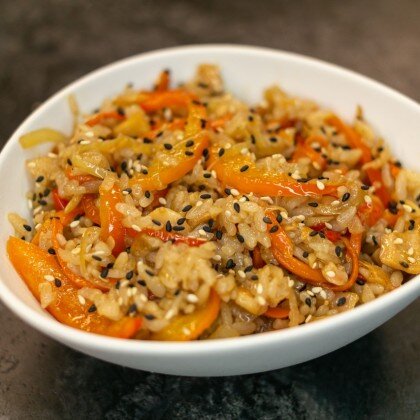 Рис, креветка, лук, морковь, перец болгарский, фирменный соус